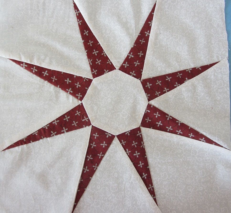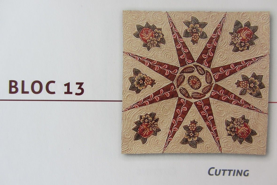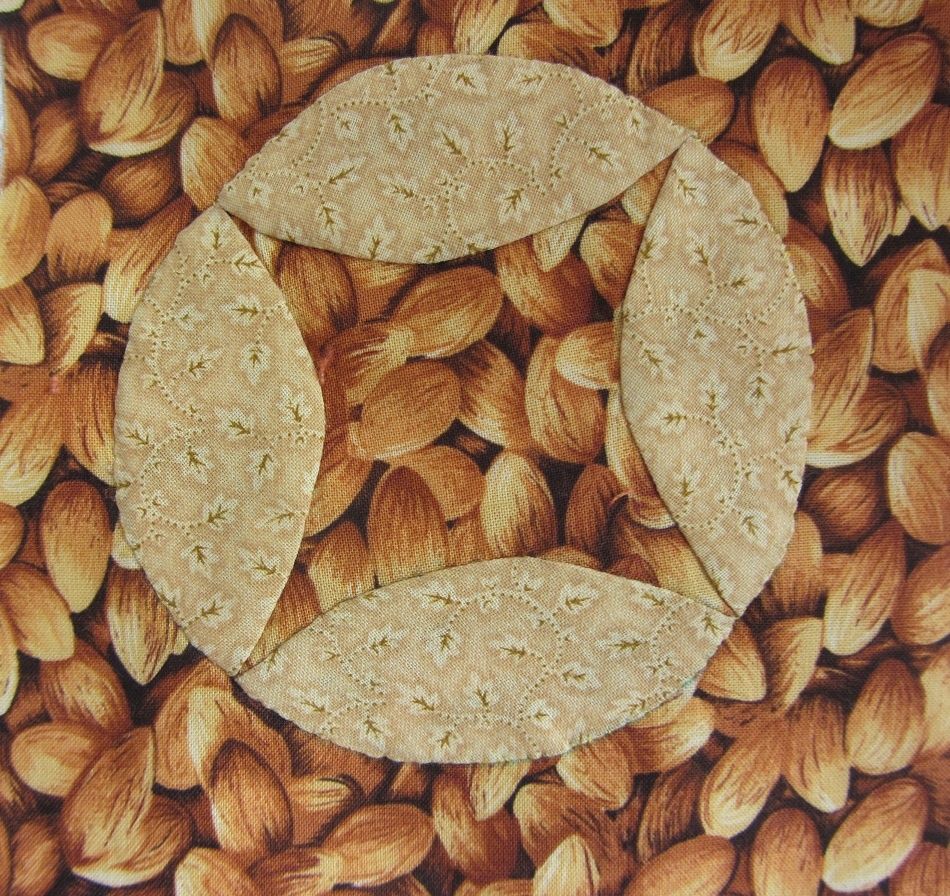 Et voici ma version. Avec un joli tissu que m'avais envoyé Josiane. Et comme je voulais mettre en valeur les amandes; je n'ai donc pas appliqué les losanges aux angles du bloc.