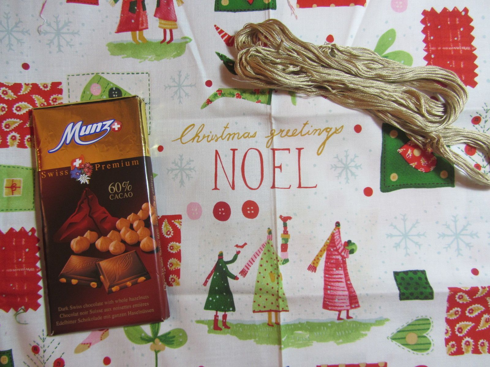 Un petit coupon de Noël tout à fait charmant, un écheveau de soie, et du chocolat c'est Noël avant l'heure.