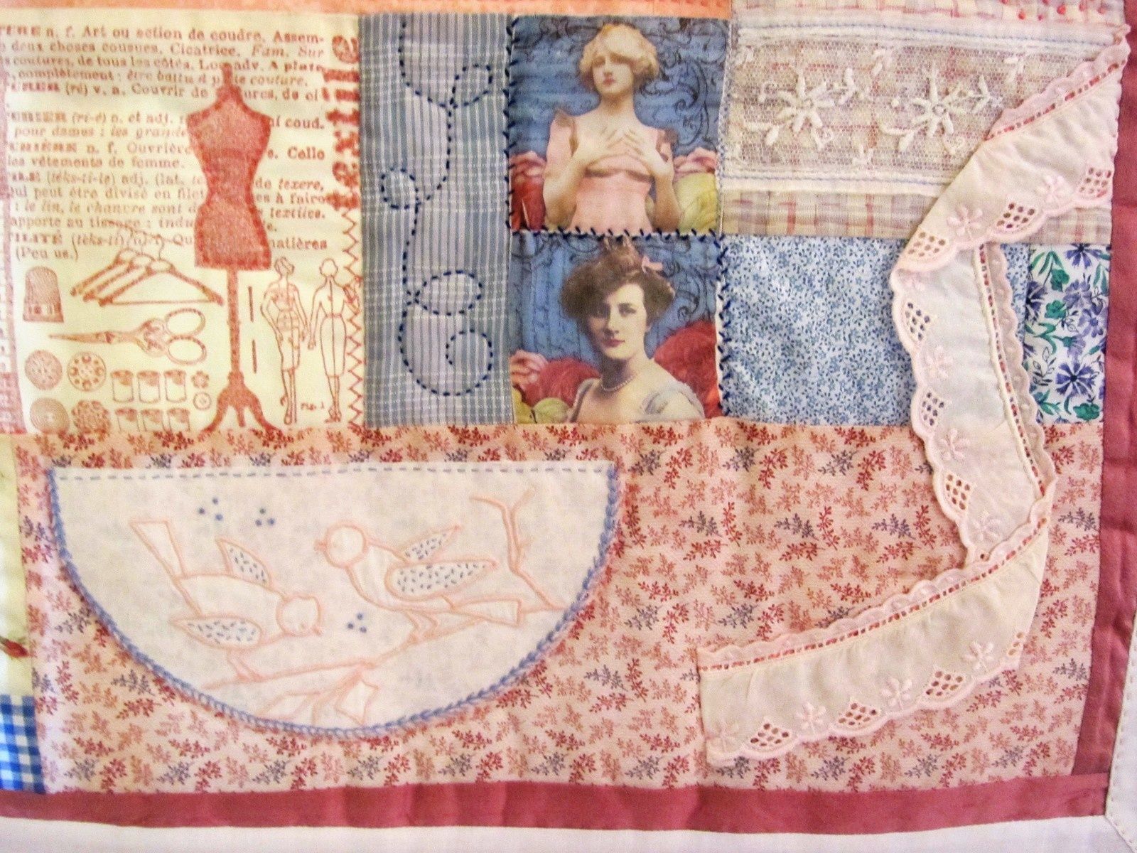 Je commence par appliquer un médaillon, découpé dans un très ancien tissu.