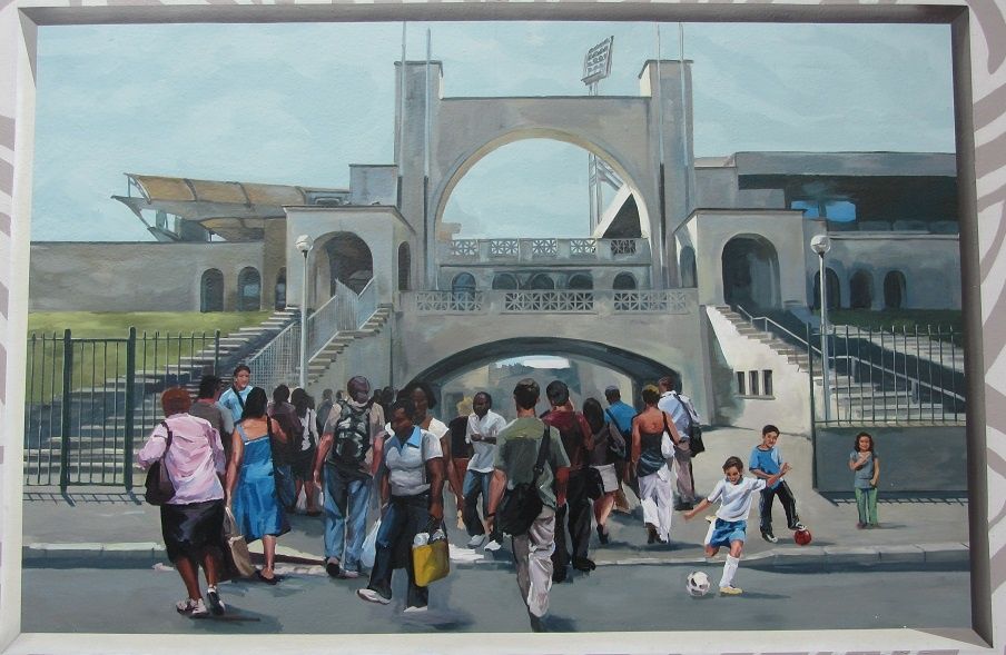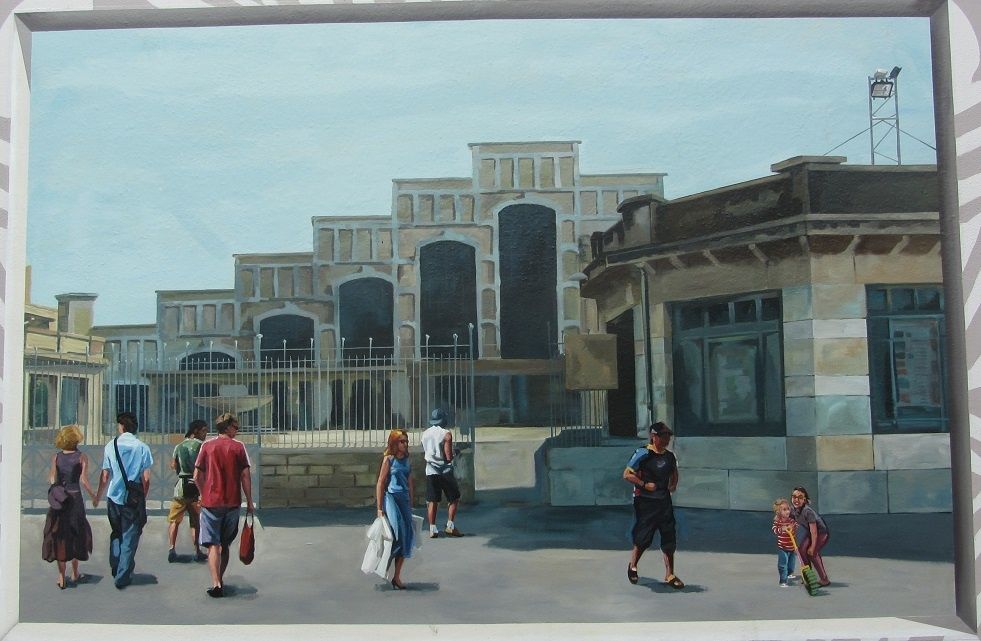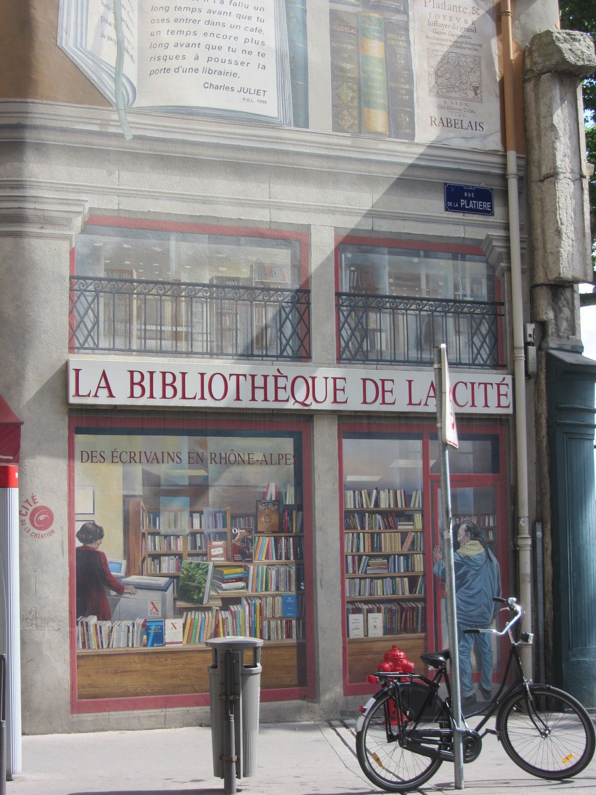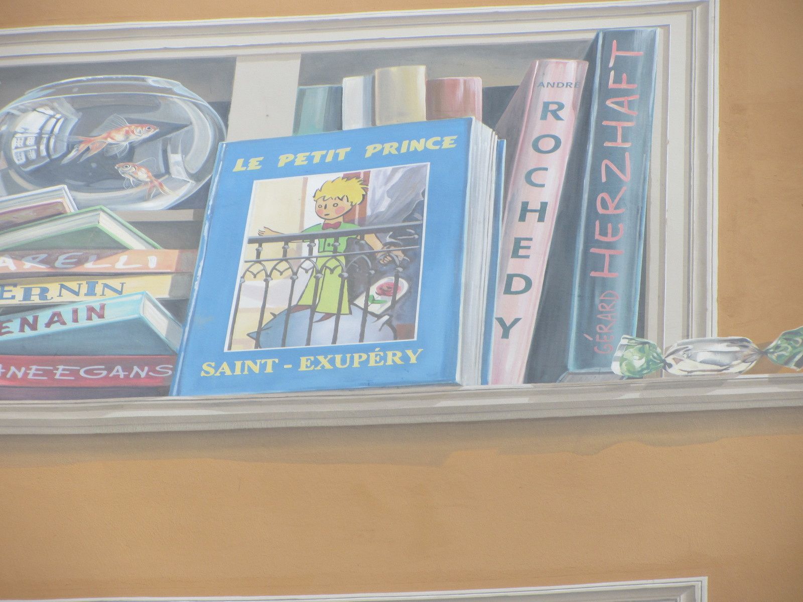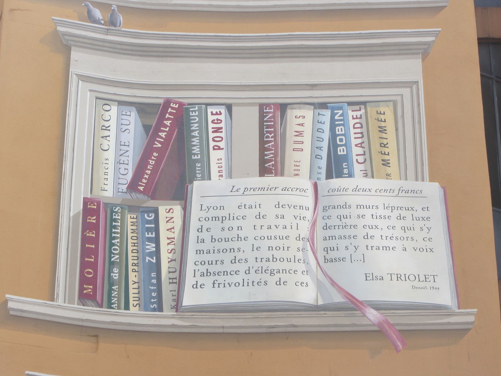 Mur peint sur 400 m². Il représente une immense bibliothèque recensant plusieurs centaines d'écrivains de genres différents
